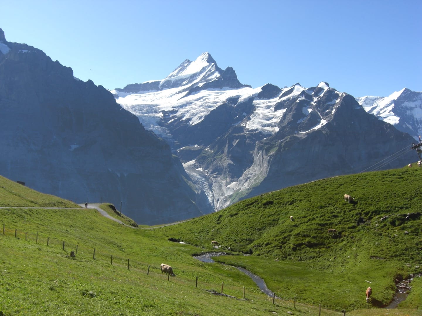 The route grants you 1 hour 40 minutes of unimpeded, fantastic vistas. The view across the valley is dominated by the stark faces of the Eiger and the Wetterhorn. These imposing edifices flank the Mättenberg, a cuddly child between two stern parents. Even if the walk had no other attractions the view of these three mountains and their glaciers would make it worthwhile.