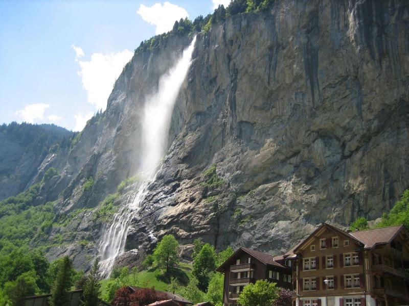 falls in Europe. Goethe described it as ‘a most wonderful thing’ and it inspired his poem ‘Song of the Spirits over the Waters’. Byron compared the fall to the long, white tail of the pale horse of the Apocalypse. But how impressive it appears will depend upon the amount of recent rainfall. The Staubbach fall is less than 1km from the village. If you desire a closer look, there is a steepish path that leads uphill, then through a short tunnel in the rock, to a viewing platform. If the fall is in full spate prepare for a bit of a soaking. The path is only open in summer. For 2.5km you walk along a narrow road that carries some cautiously moving traffic. But most vehicles are heading for the campsite that you soon pass, and they are but a minor distraction from the heady drama of your surroundings. After passing the Spissbach fall (265m) you reach the Buchenbach fall (380m), and here you might well be startled by the sound of a base jumper’s unfurling parachute, moments before landing. Devotees of this mad, extreme sport gather here, from around the globe, to get their adrenalin rush. A short way further on the number of walkers decreases as some turn right towards the Trümmelbach Falls, leaving just those who are being irresistibly drawn deeper into the valley, towards the glistening snowy peak of the Breithorn. At Stägmatta (4km) you should continue straight ahead, treading a footpath that runs close to the river. This is the shadiest part of the walk. Ignoring signs to the Shilthornbahn you follow the path as it moves away from the river and stays close to the valley side. An arched bridge sees you across the Sefinen Lütschine and brings you to the rear of the small village of Stechelberg. After crossing the Weisse Lütschine you arrive at the Stechelberg hotel, a pleasant enough place for rest and refreshment.