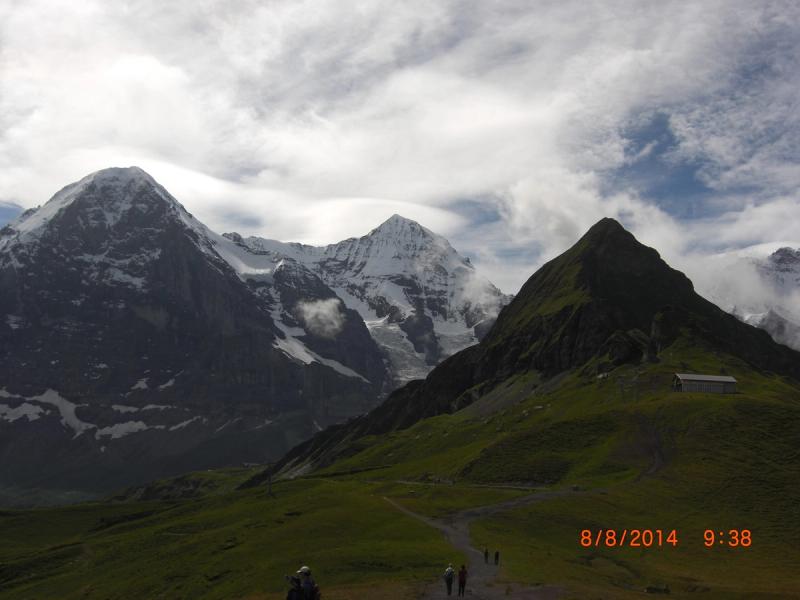 The fabulous, close up views of the North face of the Eiger and then the Mönch and the Jungfrau make this the most popular walk in the region. The wide, clearly sign posted, slightly downhill 4.5km path can be covered in about 1hour 20minutes. I have seen both the young and the elderly enjoying this walk. Männlichen (2229m) is reached by cable-car from Wengen or by gondola from Grindelwald Grund. My preference is for the long, tranquil gondola ride. Getting from Grindelwald railway station to Grund involves a 15minute, quite steep, downhill walk. Alternatively you can connect by train or bus. Somewhat bizarrely the Swiss Pass allows a free bus ride, but only a reduced rail fare. The path from Männlichen heads south, taking you along the eastern slopes of the Tschuggen. Below you stretches the green Grindelwald basin. Look to your left and you can pick out the Schynige Platte, Faulhorn, Schwarzhorn and Wildgärst. At the far end of the basin the Wetterhorn looms over Grosse Scheidegg. But directly ahead of you, getting ever closer, is the breathtaking, threatening north face of the Eiger. I am awestruck when I contemplate the achievement of the Swiss speed climber Ueli Steck, who recently scaled this monster in 2 hours 47 minutes. Beyond a grassy picnic area, replete with blooming alpine plants if the season is right, a bend in the path brings the Mönch and the Jungfrau into full view. The looping path takes you past the Inberg gully between the Tschuggen and the Lauberhorn. Another change in direction leads you along the slopes of the Lauberhorn and then to the final short, steepish descent to Kleine Scheidegg (20161m). Kleine Scheidegg has a strangely appealing atmosphere. It is a lively, bustling place, particularly when trains from either Wengen or Grindelwald disgorge their passengers who then jockey for a place on the waiting Jungfraubahn. The aroma of barbecuing bratwurst wafts past, and every so often the haunting sound of an alpenhorn fills the air. Most of the early conquerors of the north face of the Eiger stayed at the Scheidegg hotels. If, following a drink on the terrace of the historic Hotel Bellevue Des Alpes, you need to visit the toilet you will pass photographs of famous guests, including Clint Eastwood who was here for the filming of ‘The Eiger Sanction’. There are regular trains to Grindelwald and to Lauterbrunnen (via Wengen). Holders of a Swiss Pass get discounted, but not free travel both to Grindelwald and to Wengen.